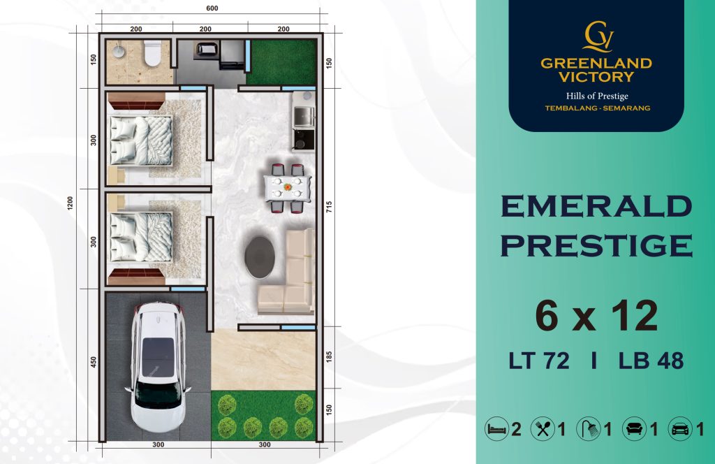 Tipe Emerald di Greenland Victory hadir sebagai solusi hunian satu lantai yang nyaman dan fungsional, dengan dua pilihan versi bangunan yang dapat disesuaikan dengan kebutuhan dan gaya hidup Anda. Keduanya dibangun di atas lahan 6 × 12 meter (LT 72 m²), namun memiliki perbedaan pada luas bangunan dan pengaturan ruang.